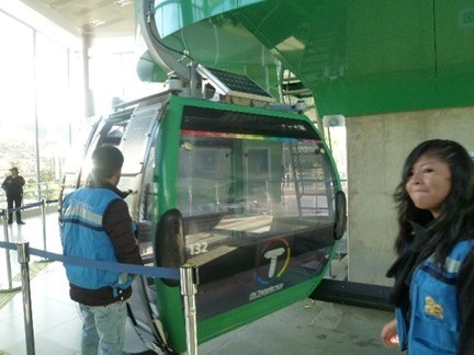 The routes on this ropeway network are differentiated by the color of the gondola: red, yellow, green, and blue, making it easy for us foreigners to understand and ride. The fare is inexpensive at 3 bolivianos (approximately 50 yen) per route, making it a very convenient means of transportation for La Paz residents. The green gondola in the photo runs from the Calacoto district, where the wealthy people of La Paz live, to an area called Libertador .